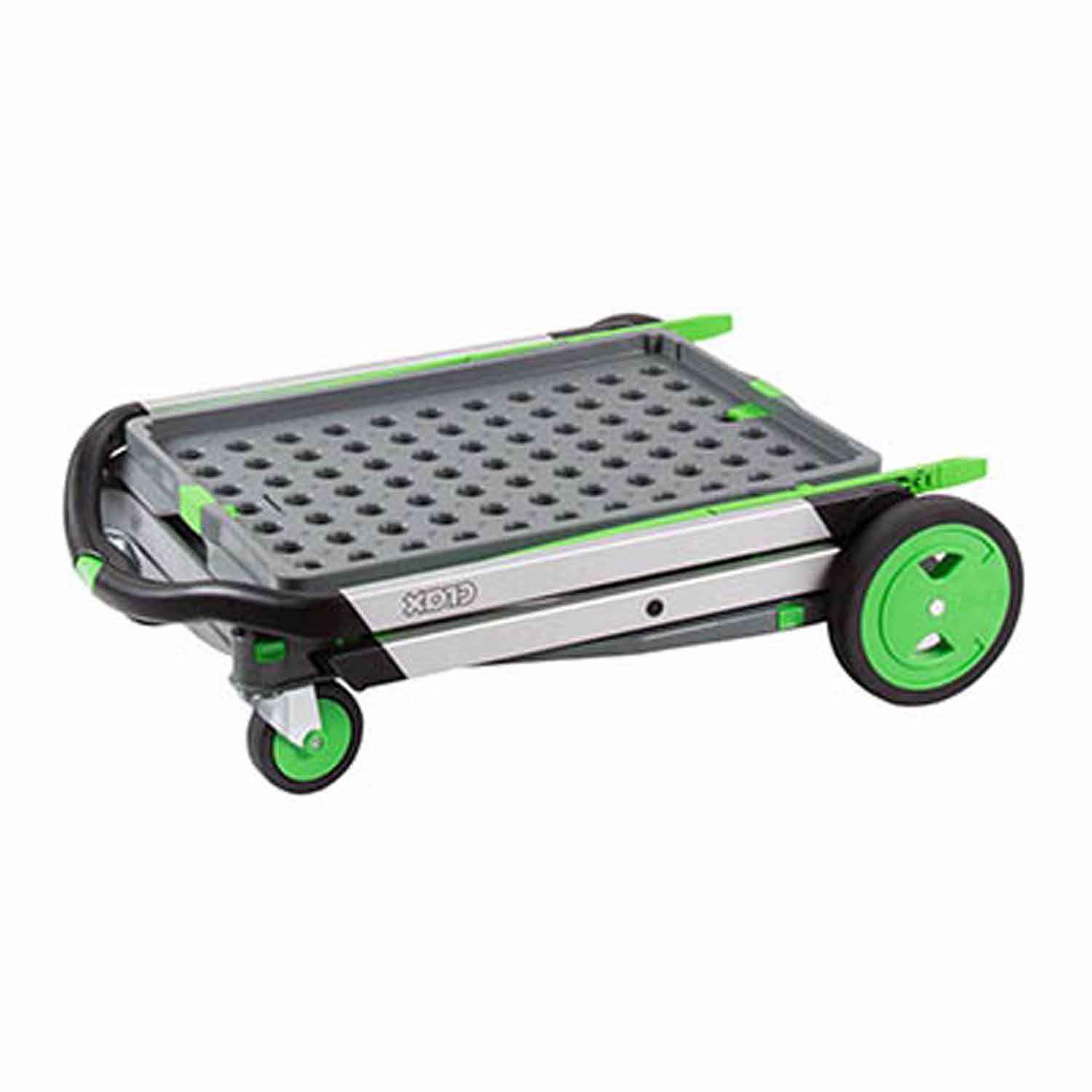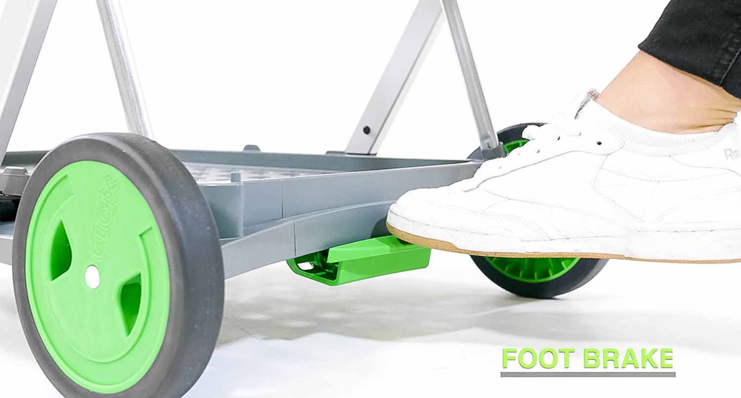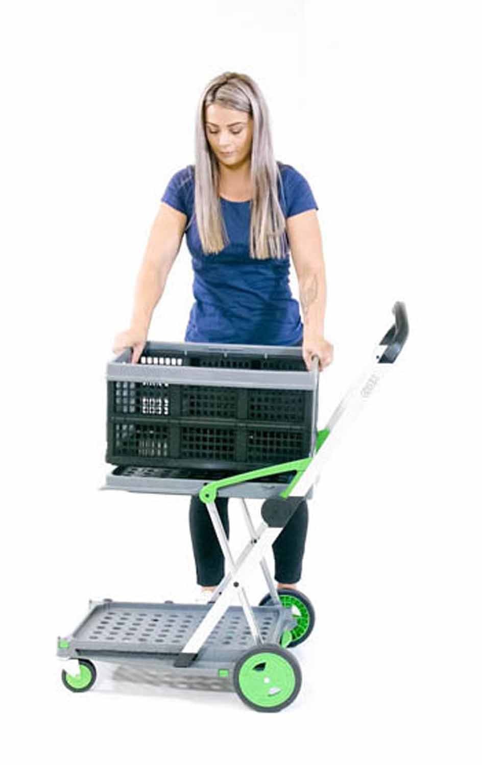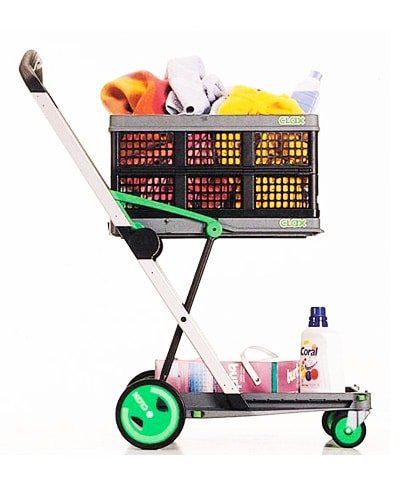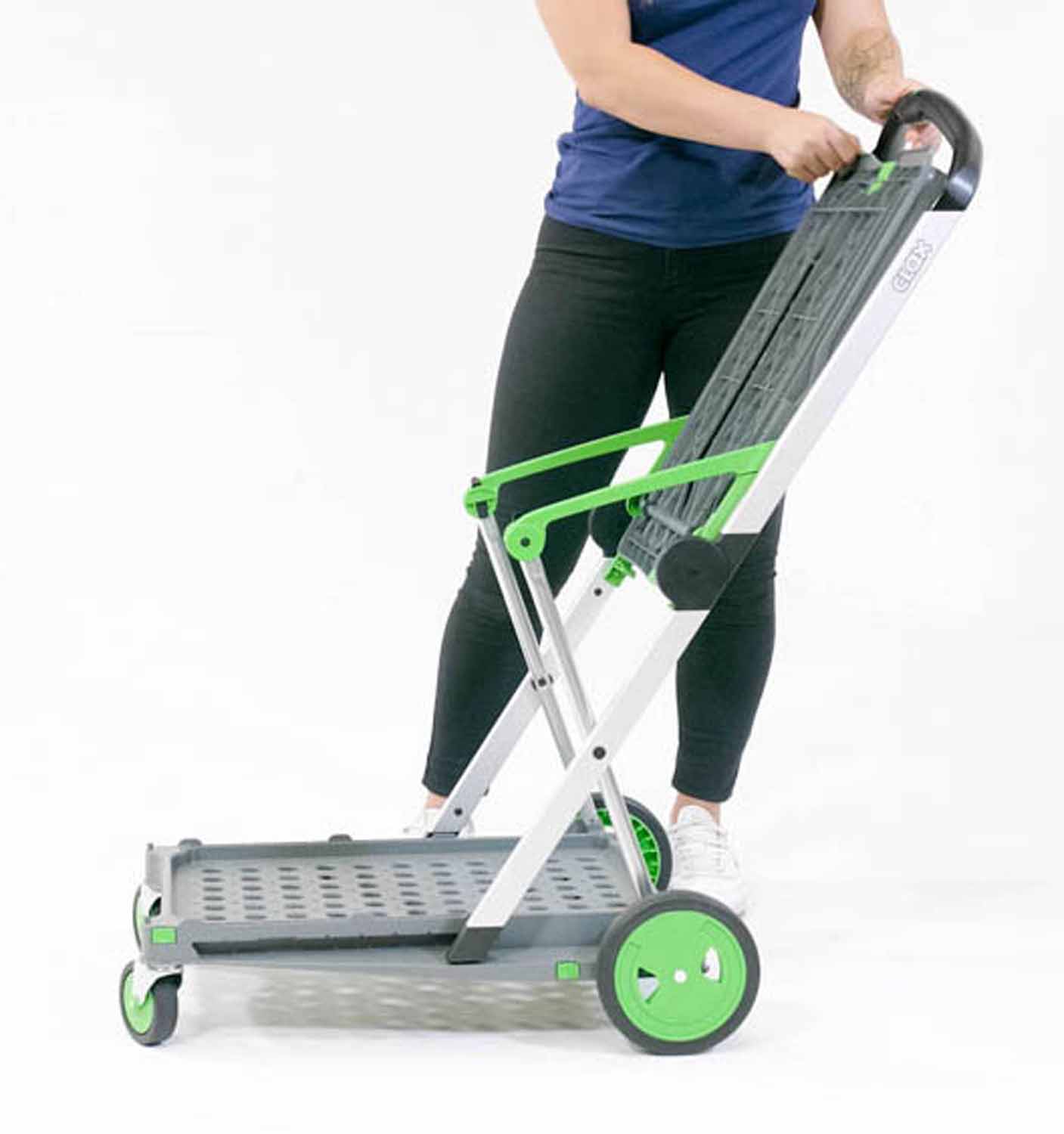 The Clax Cart has an ergonomic handle with a simple push button that provides the effortless folding function. It also has a number of great design features, including a wheel brake mechanism, one collapsible crate, and a lift-up tray.